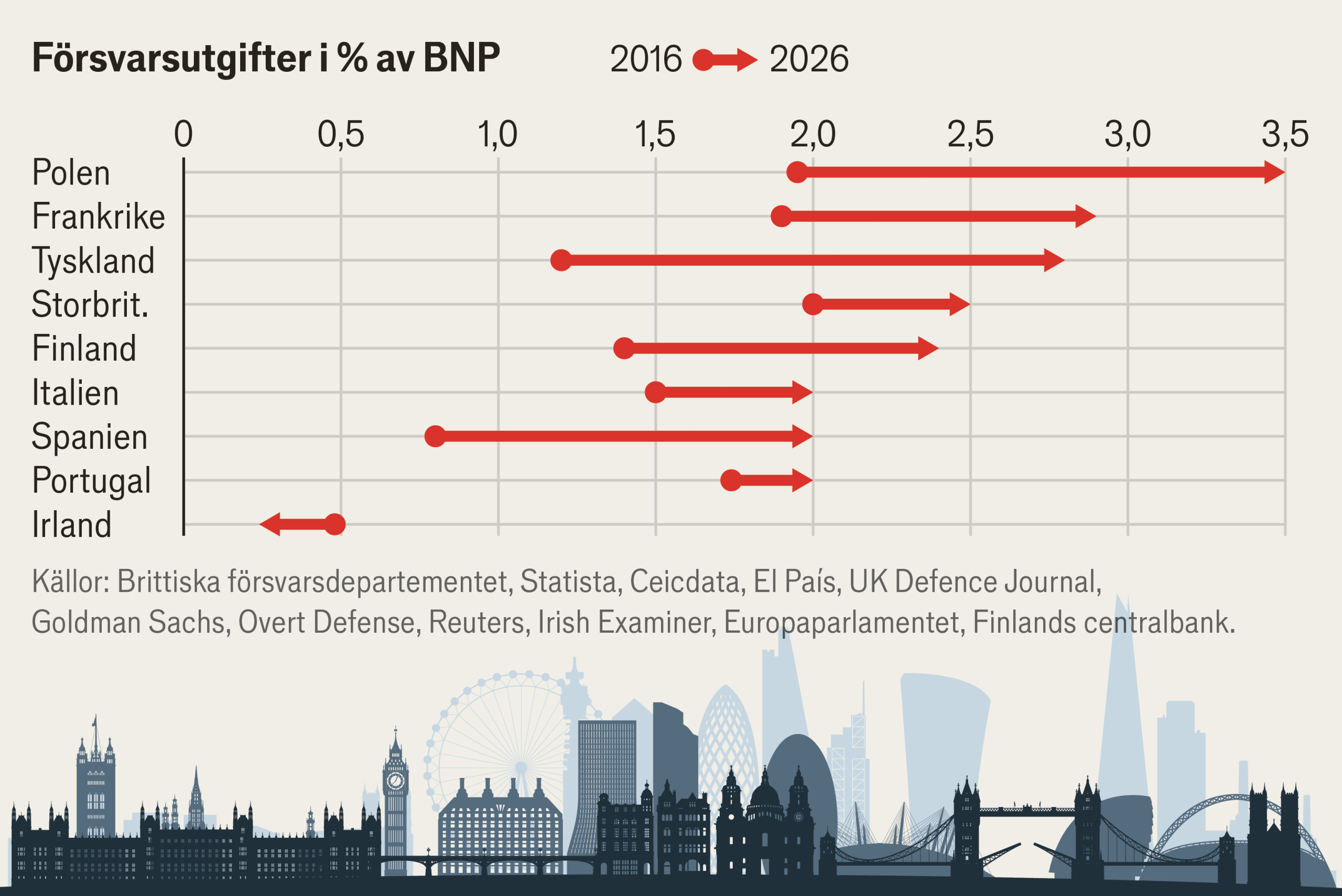 Här kan du jämföra BNP, tillväxt, inflation, budgetbalans och köpkraften i 30 europeiska länder. Totalt ökar tillväxten något 2026, och lönerna har utvecklats snabbare än inflationen. De europeiska konsumenterna verkar dock fortfarande hålla hårt i plånboken. Största förändringen 2026 är de ökade försvarsanslagen och att den växande politiska klyftan mellan USA och Europa får europeiska länder att köpa allt mer från europeiska leverantörer.