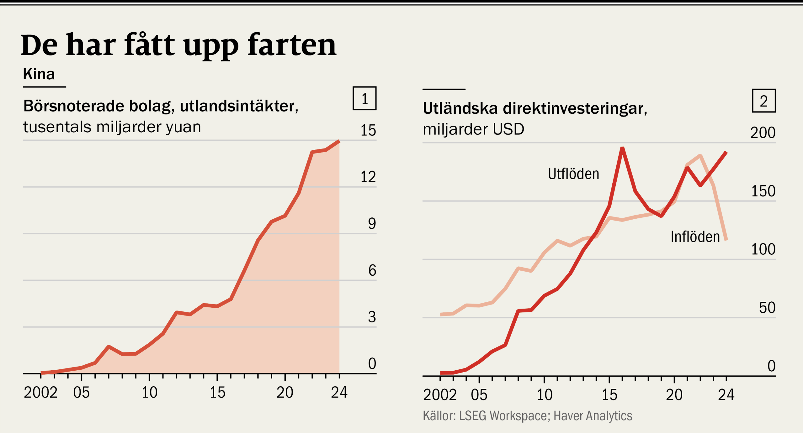 Denna senaste våg av global expansion är anmärkningsvärd både vad gäller bredd och hastighet. 2024 genererade börsnoterade kinesiska företag 15 000 miljarder yuan, cirka 20 000 miljarder kronor, i utlandsförsäljning, en ökning från 11 600 miljarder 2021 (se diagram 1). Kinesiska företag investerar nu mer utomlands än utländska företag gör i Kina (se  diagram 2). Lika slående är de förändringar som sker i hur kinesiska företag tar sig an utlandsetableringar, när de försöker skapa större fysisk närvaro utomlands i en geopolitiskt stökig värld.